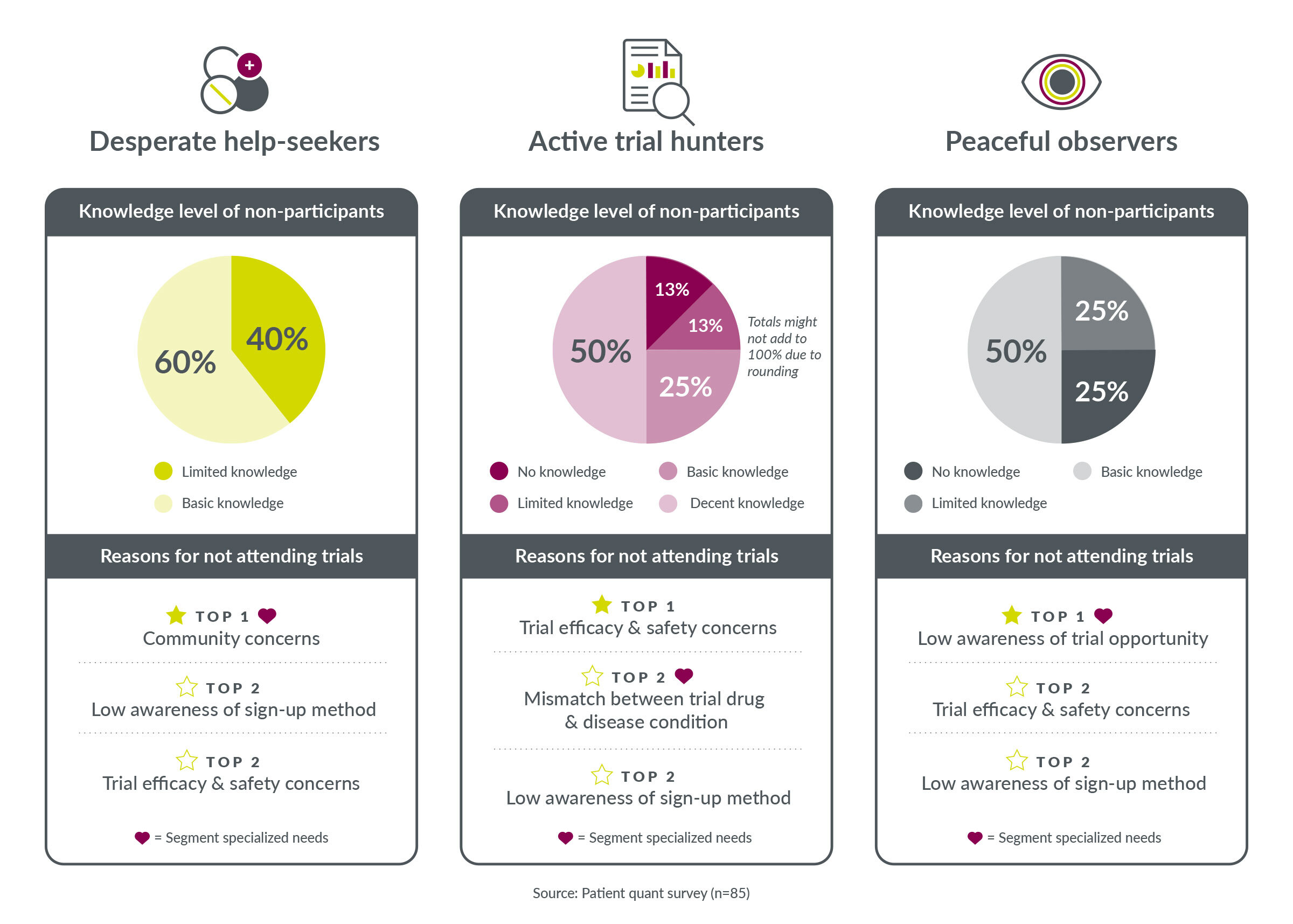 The obstacles to participation vary by segment (Figure 1). Overall, the most significant is patients not being aware of the availability of clinical trials. Second, they may find it difficult to understand the process of signing up for a trial, especially if the sponsor does not provide clear guidance. Finally, patients may be concerned about the effectiveness and safety of a trial.