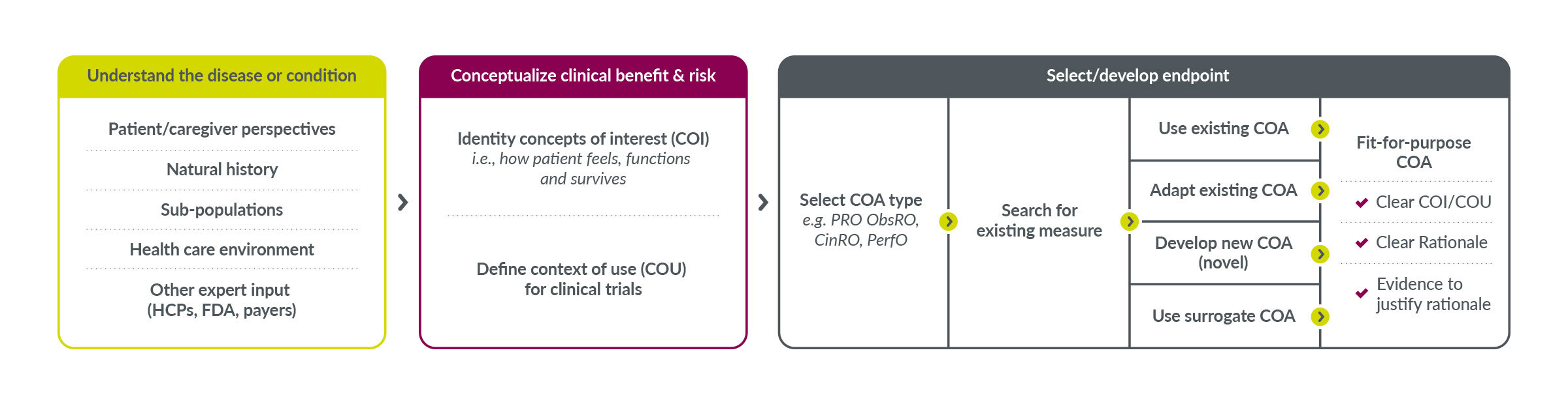 At Parexel, we apply key performance indicators (KPIs) to new or existing COAs to determine if they are fit for purpose. Sometimes we find an existing COA that works or can be modified. Other times it is necessary to develop a wholly new COA or combine elements of existing ones into a new measure. When we determine that a COA is critically flawed, we move on and find better ones.